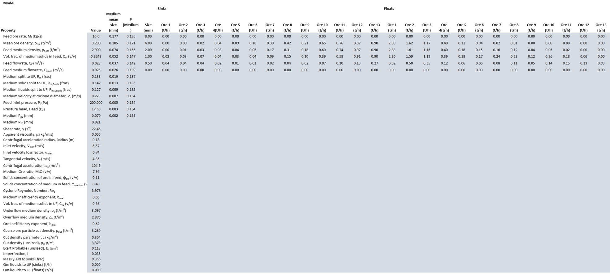 | Cyclone (Dunglison) | The Dunglison dense medium cyclone model is used to determine the partition of solids to sinks (underflow) and floats (overflow) for each species and size interval. | |